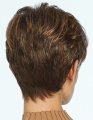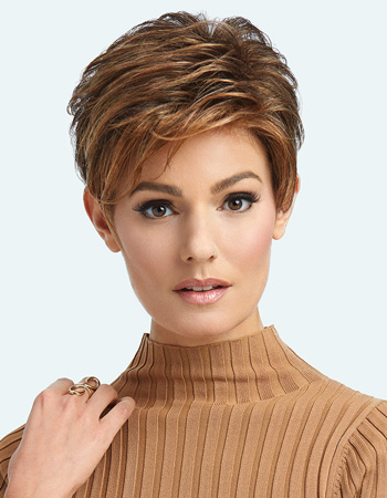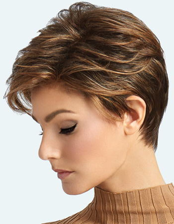 Long layers throughout the top and crown combine with loose textured lengths to create a completely free-formed, windswept look. For added styling excitement, this short silhouette is complimented by a smooth neck hugging nape.