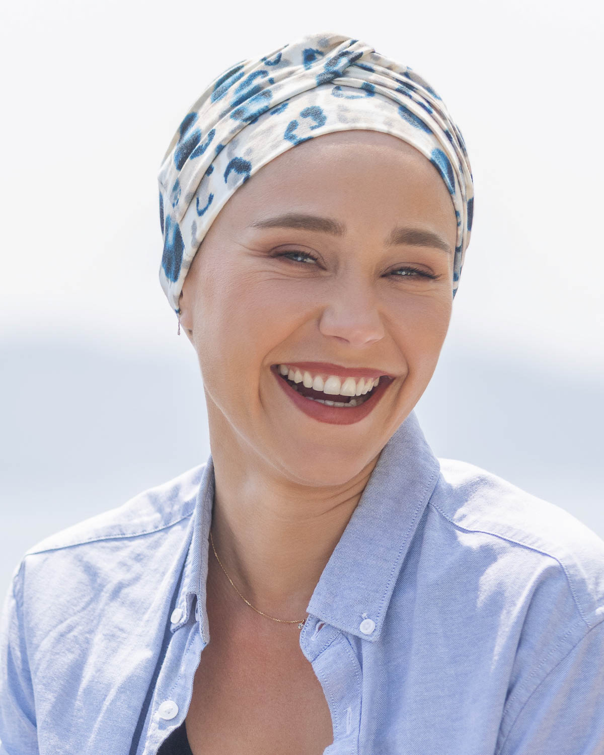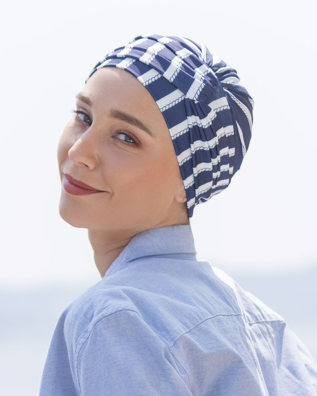 A beautiful light bamboo turban that's perfect for warmer days! The cross-over effect on the front gives it a chic, modern look