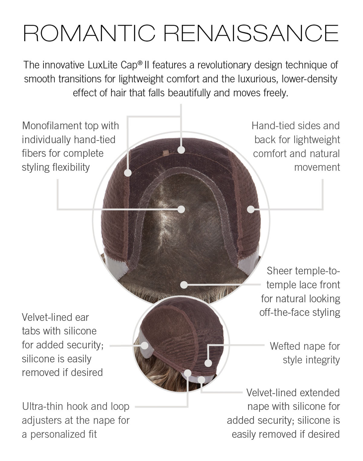 The Sheer Luxury Collection features the LuxeLite Cap II : . Smooth transitions connect the sheerest, most resilient modern materials using a revolutionary design technique. Less complexity results in a more natural look with hair that falls beautifully and moves freely. The minimalist silhouette lies flatter to the head for a lower-density effect. With no bulky borders, there’s nothing to stop you from achieving the look you love.