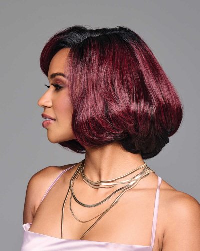 From her striking silhoutte created by the chic, stacked back to her softly sculpted eyelash fringe and a host of soft layering throughout. And let’s give a special round of applause for that realistic monofilament part with a lace front for off the face styling.
